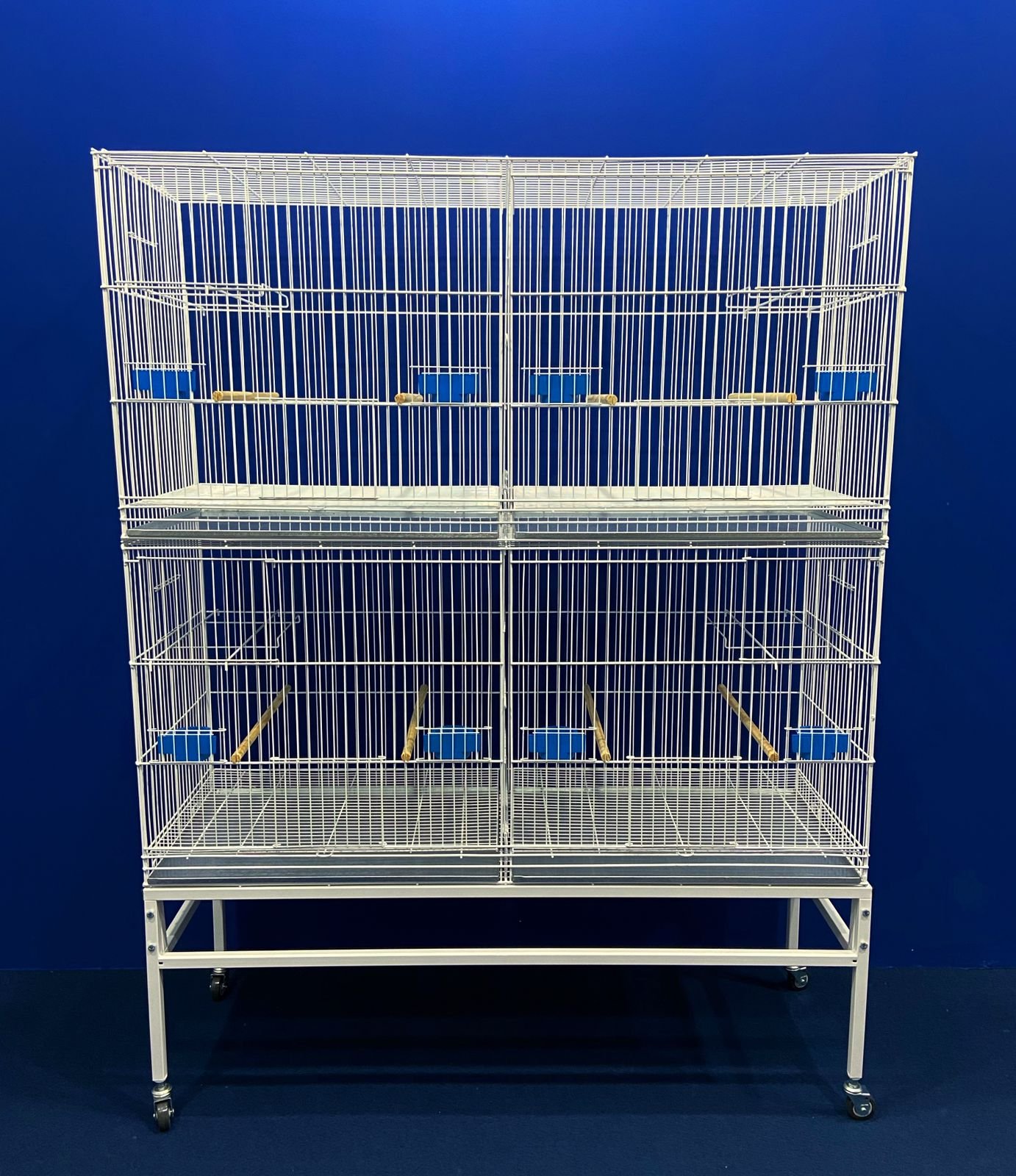 6 poleiros de madeira, 4 comedores plásticos, 2 chapas de fundo, 2 grades de fundo, 2 suportes para ninho, e 1 grade divisória (todos removíveis).