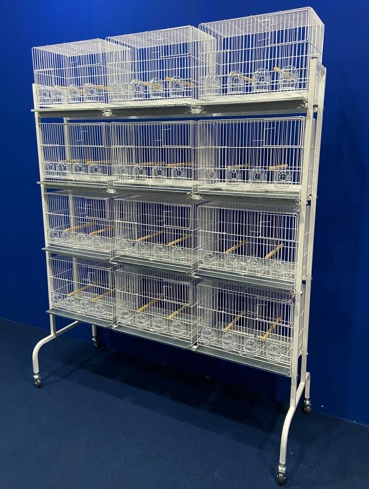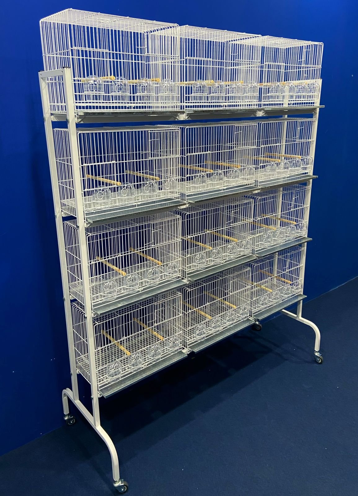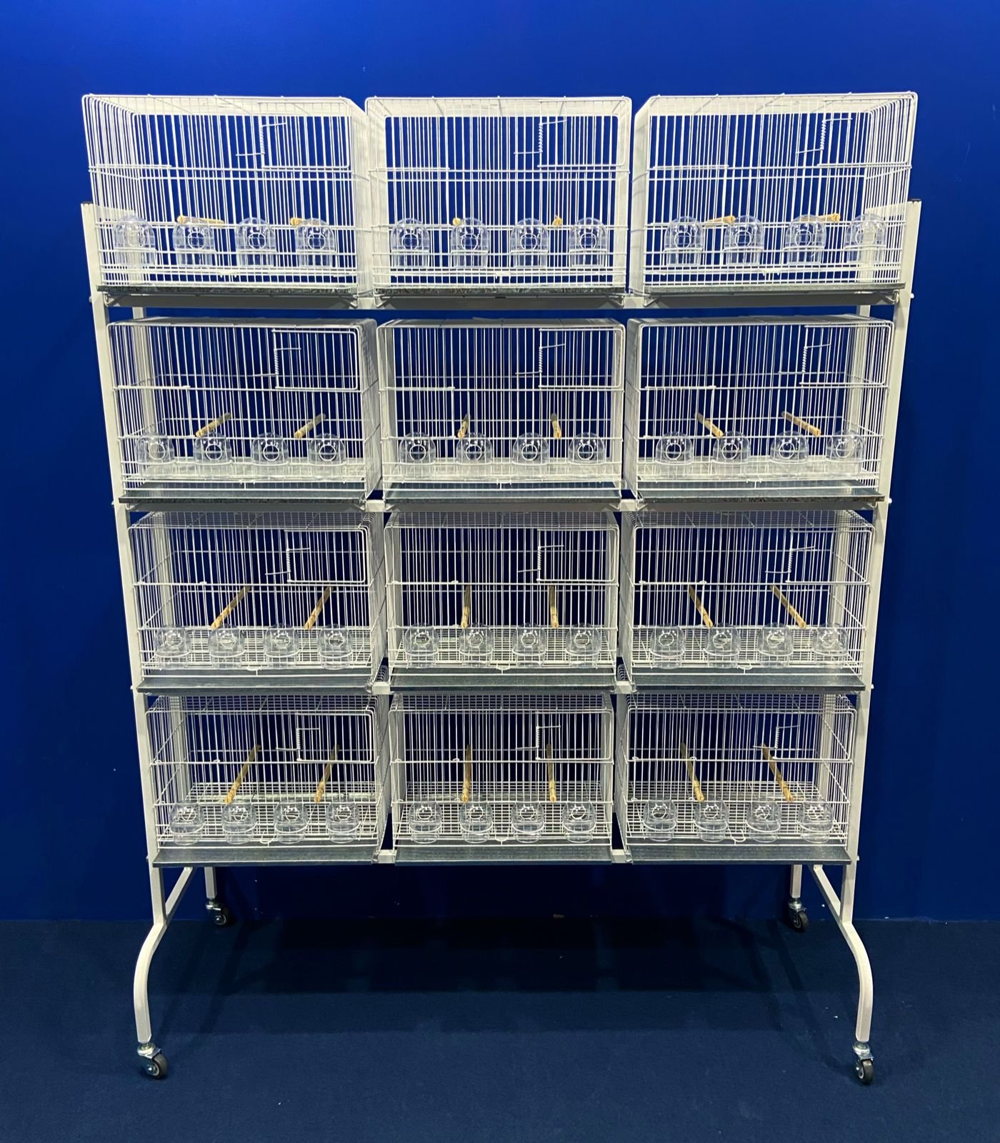 211 – CONJUNTO 12 CRIADEIRAS P/ CANÁRIO (4 COMEDORES) + ESTANTE COM RODAS