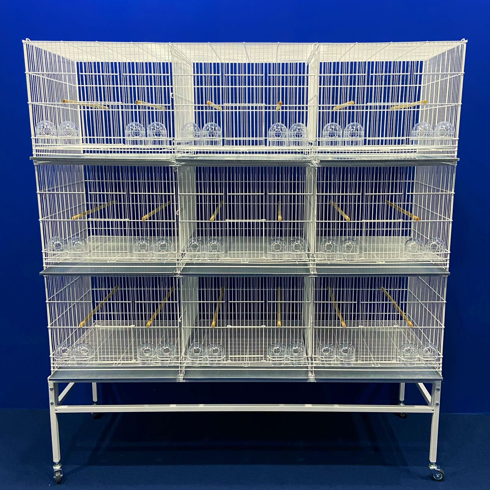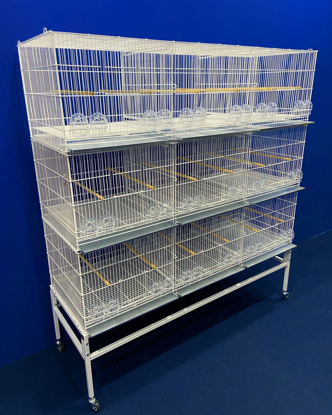 6 poleiros de madeira 12mm, 12 comedores 1/2 lua transparentes, 3 chapas de fundo, 3 grades de fundo, e 2 grades divisórias (todos removíveis).
