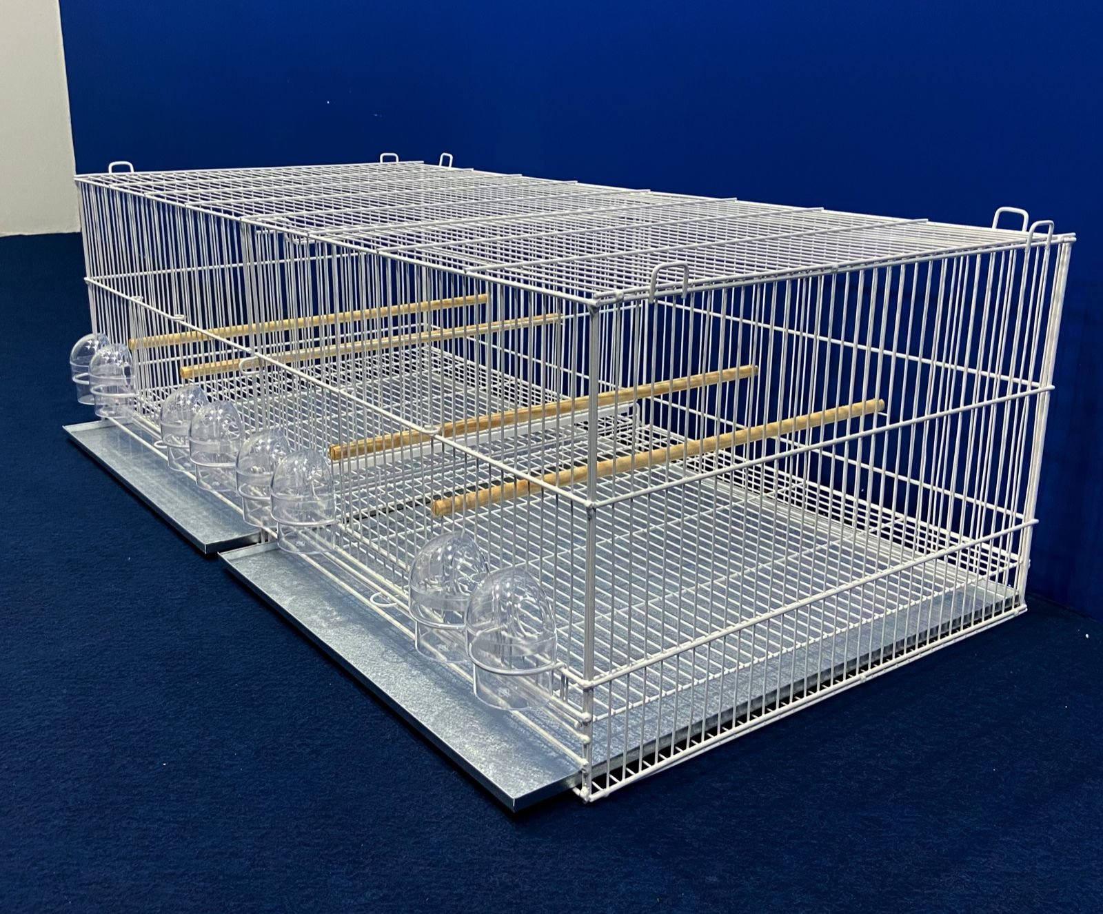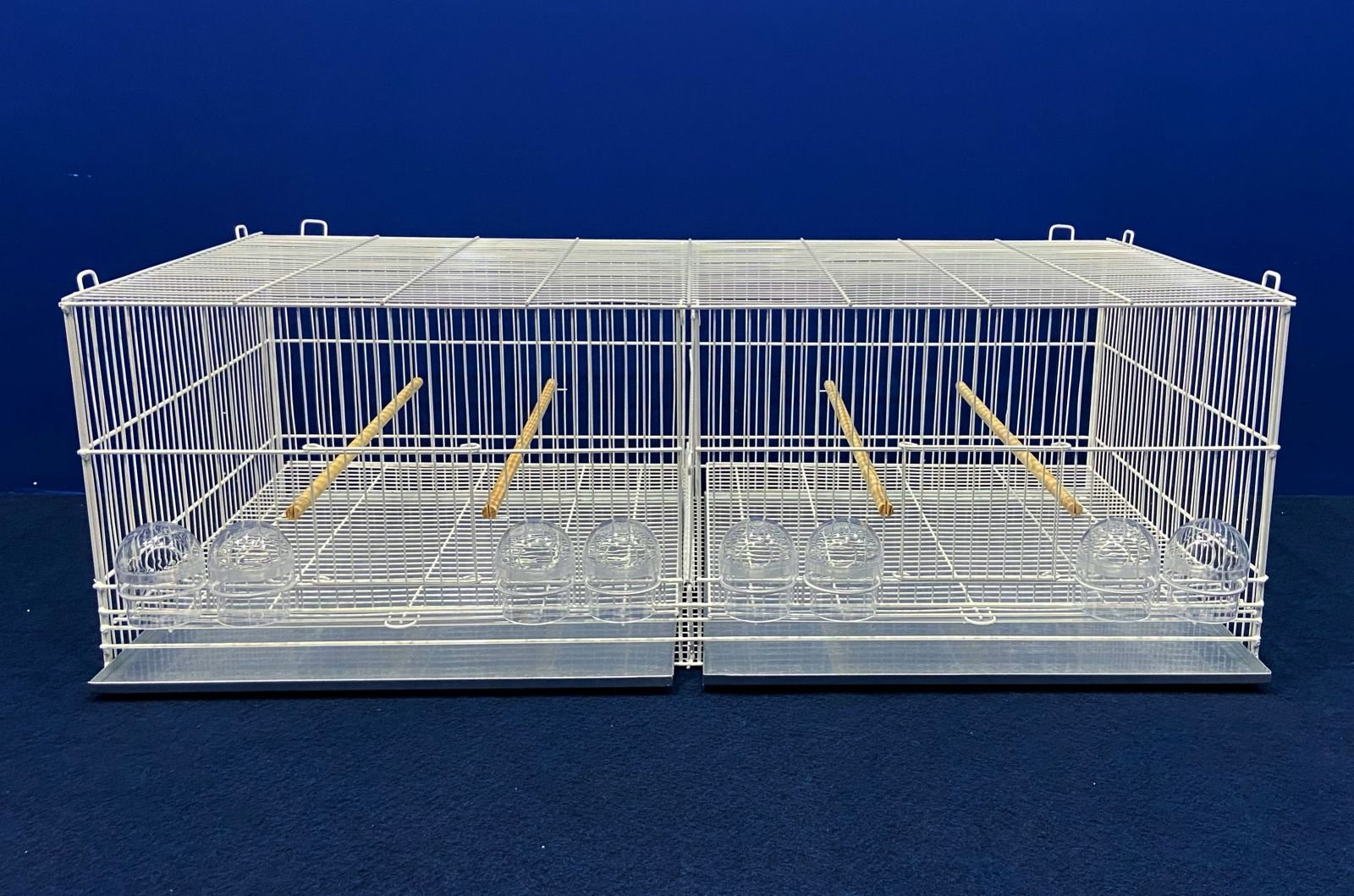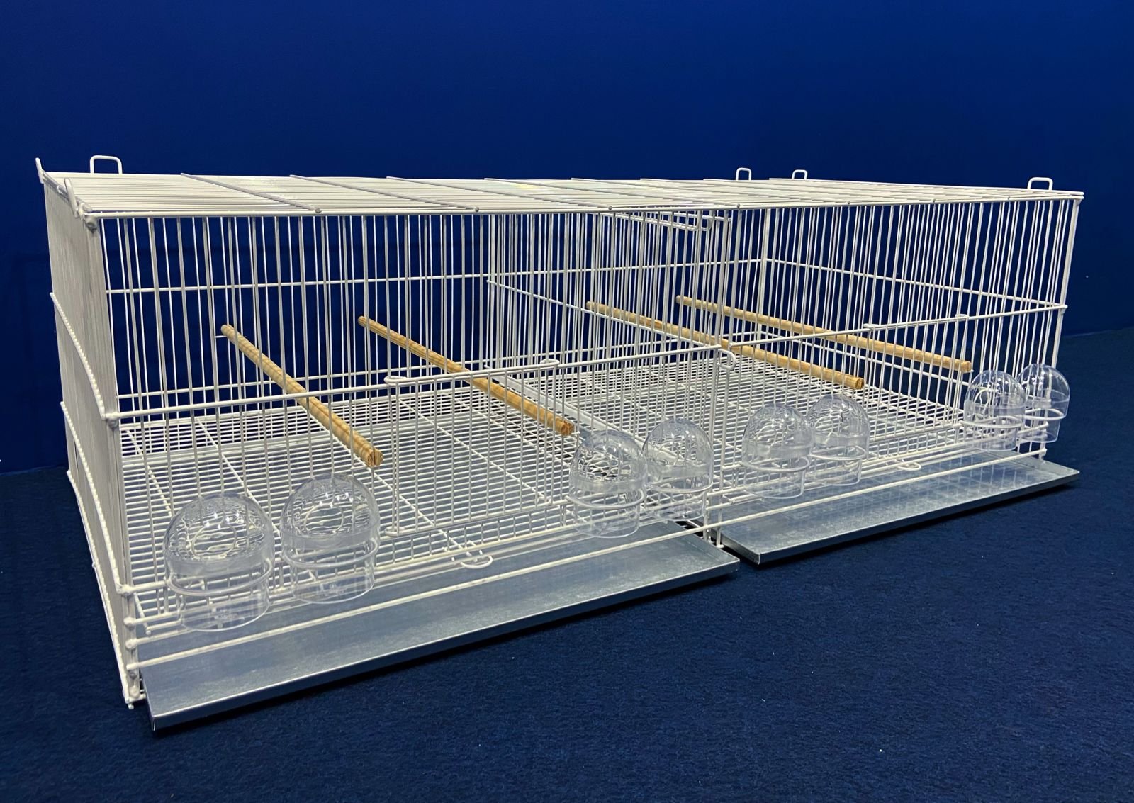 4 poleiros de madeira 12mm, 8 comedores 1/2 lua transparentes, 2 chapas de fundo, 2 grades de fundo, e 1 grade divisória (todos removíveis).