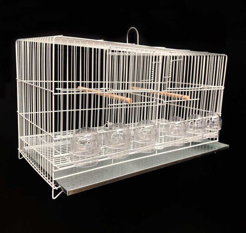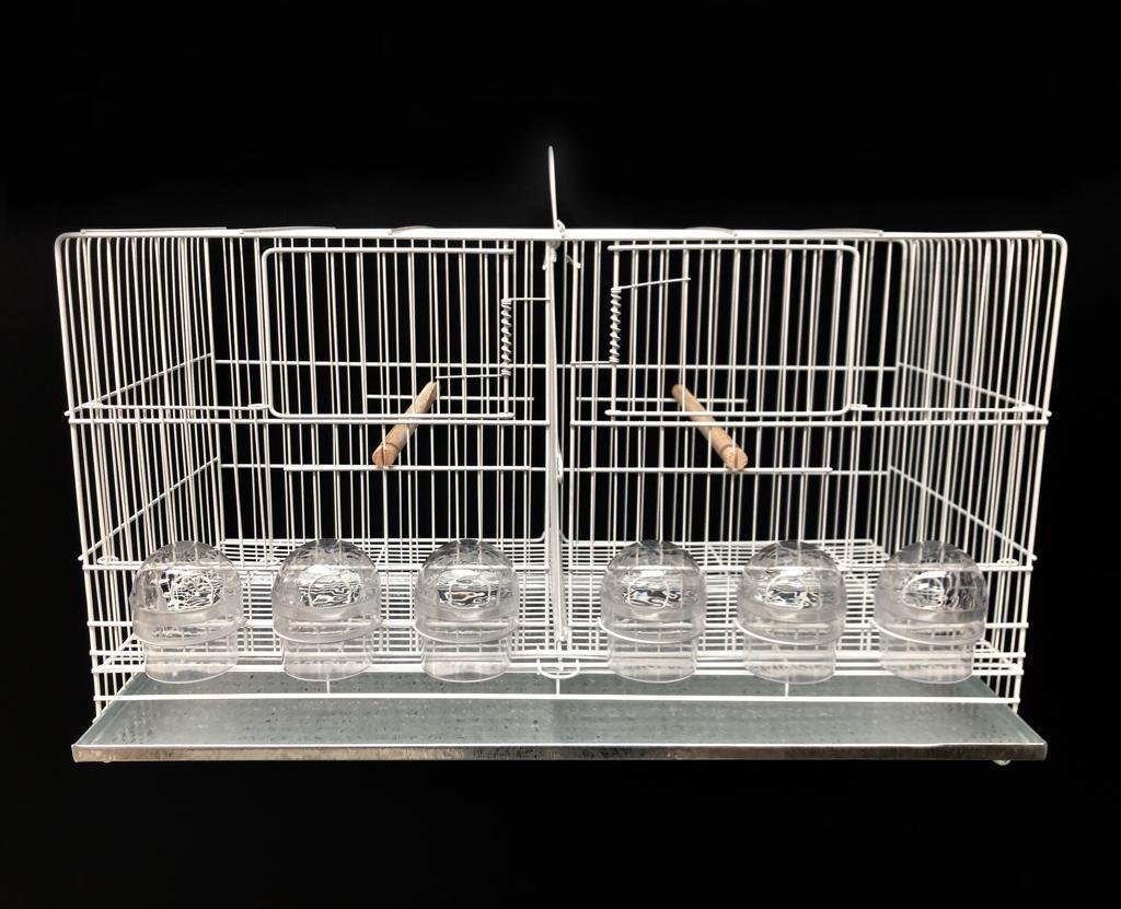 4 poleiros de madeira, 6 comedores 1/2 lua transparentes, 1 chapa de fundo, 1 grade divisória e 1 grade de fundo removíveis.