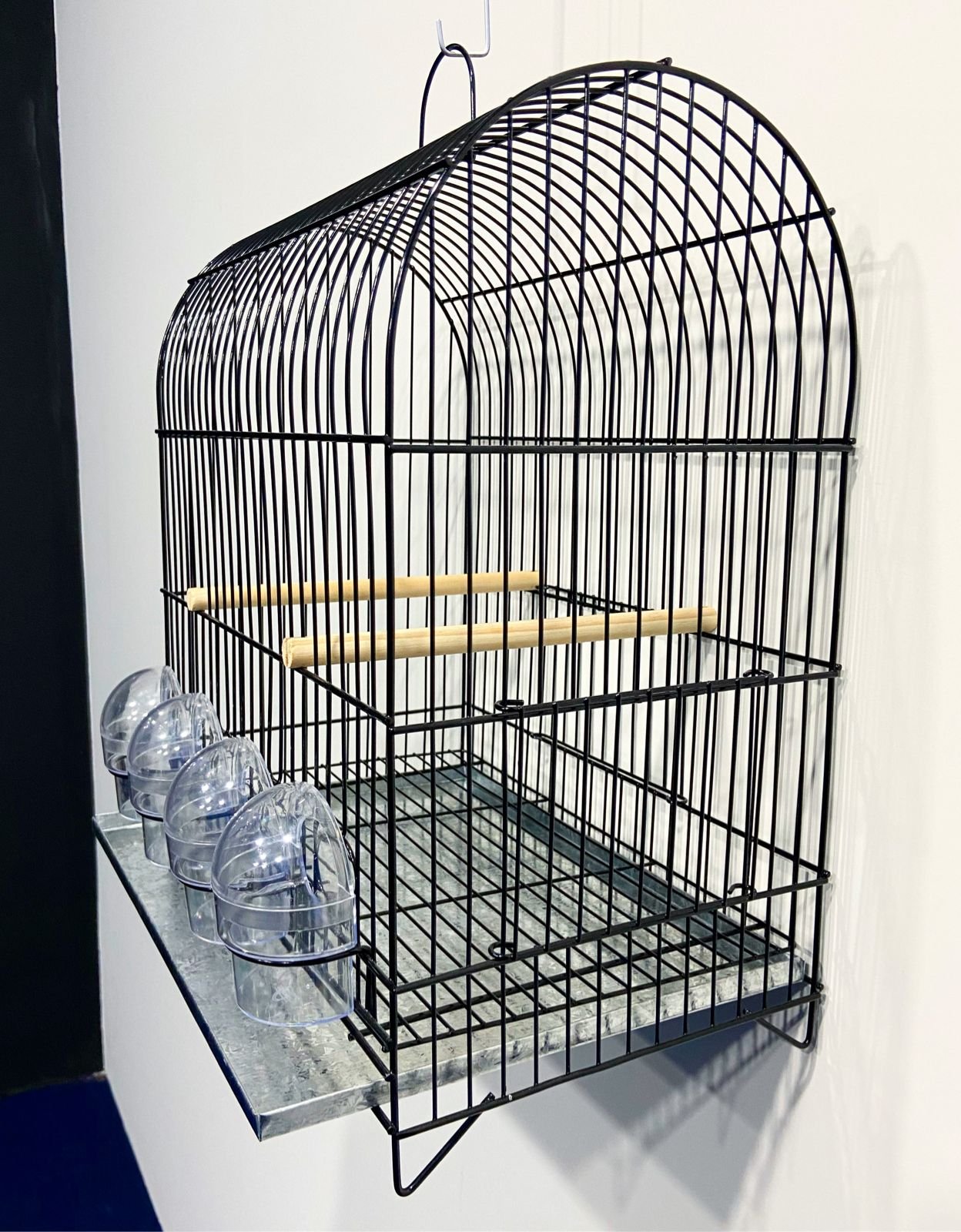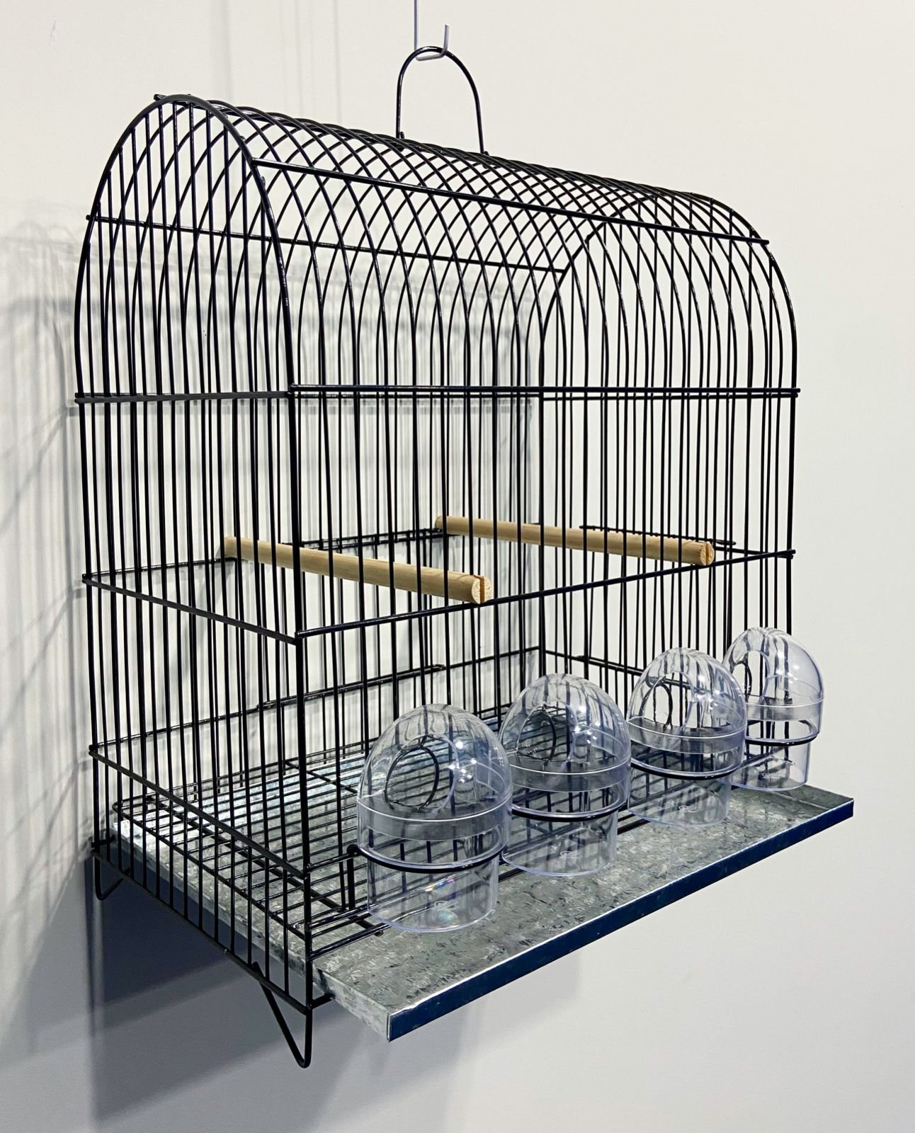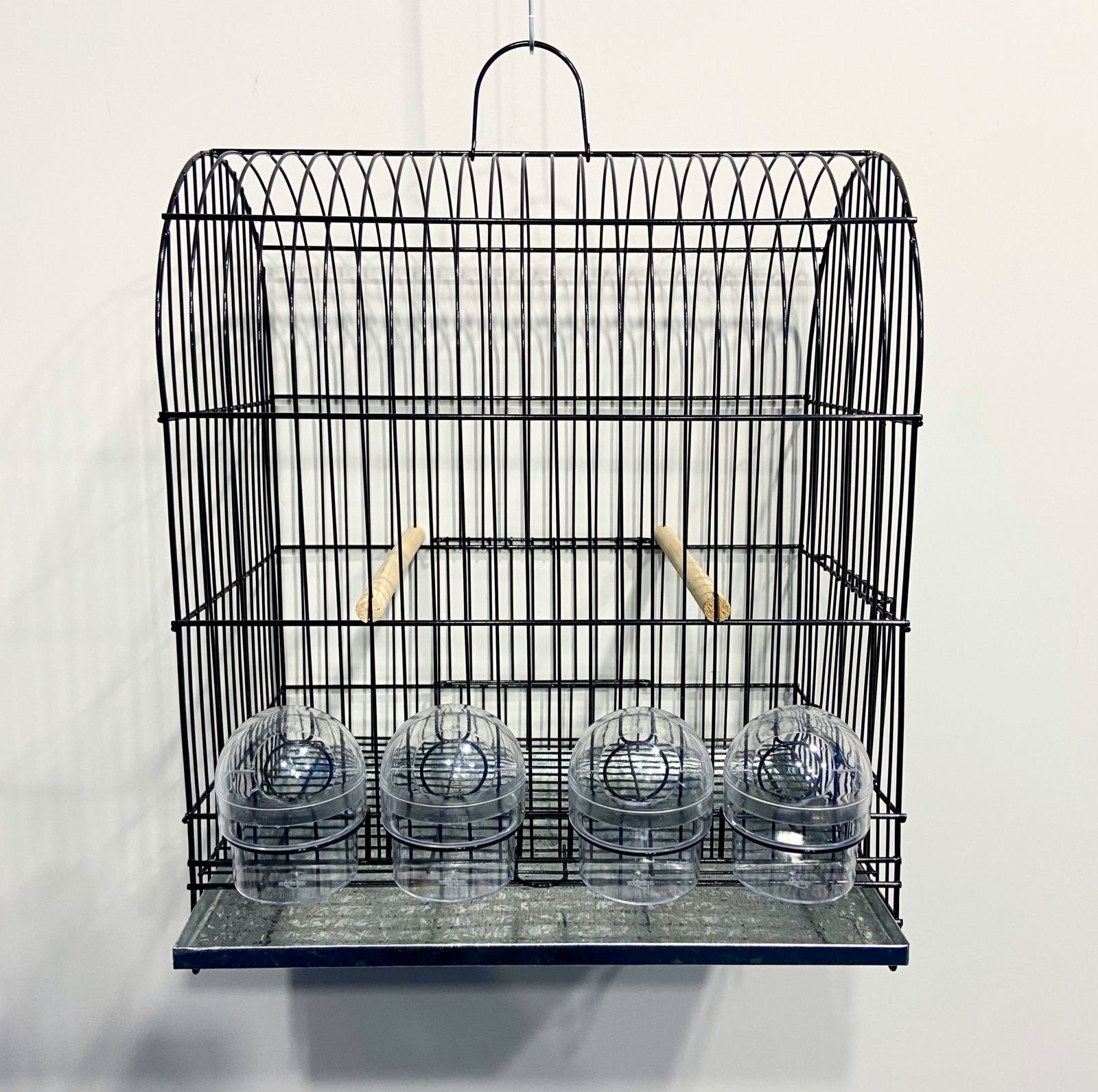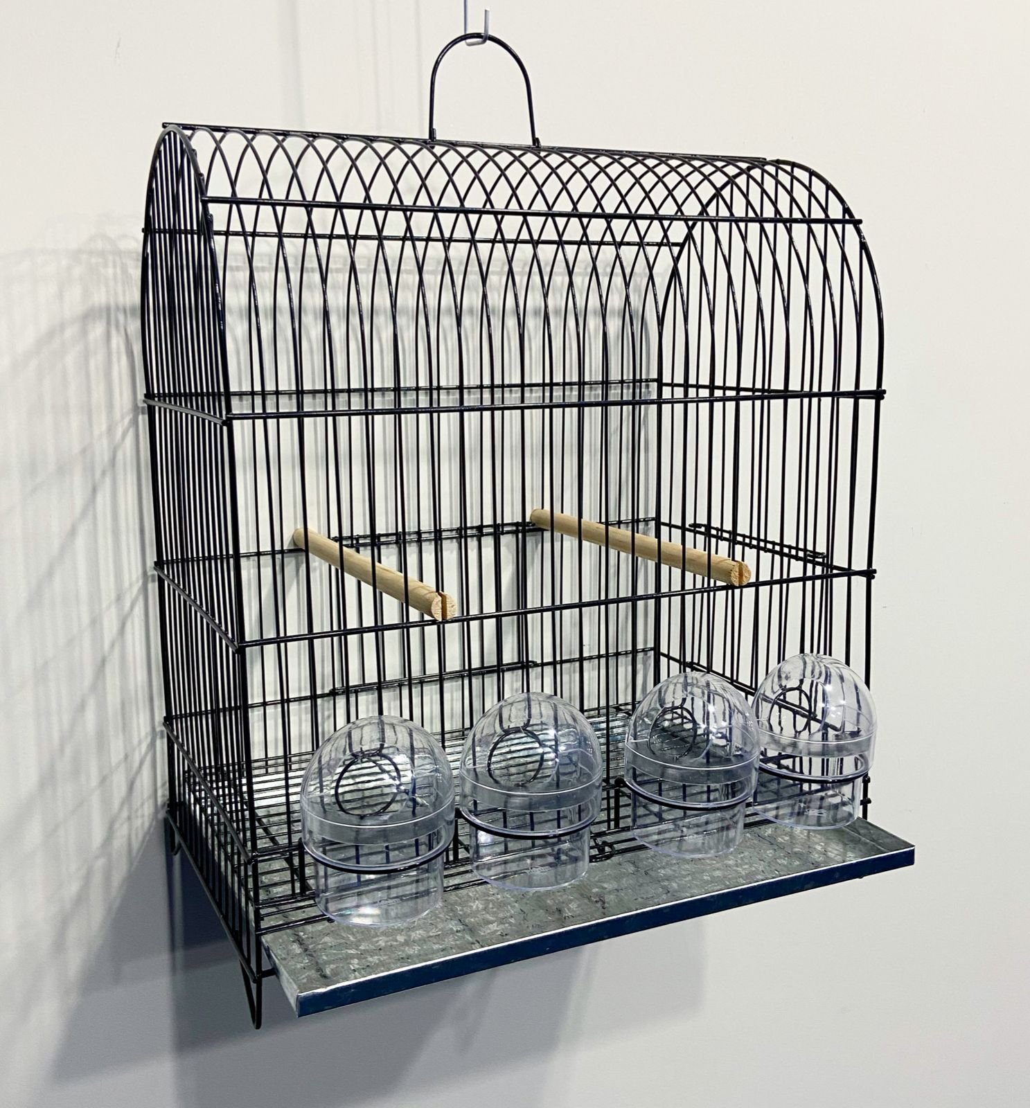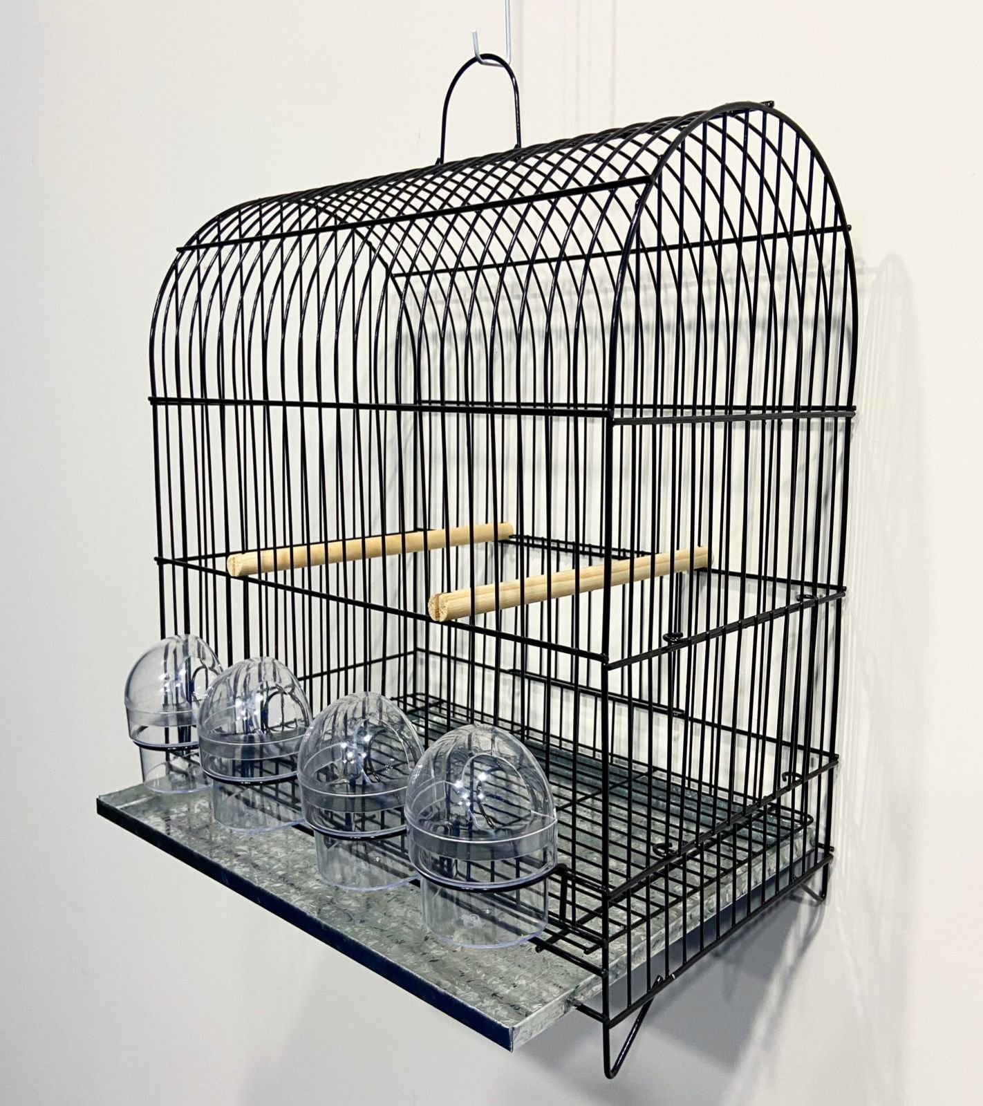 2 poleiros de madeira, 4 comedores 1/2 lua transparentes, 1 grade de fundo, e uma chapa de fundo removível.