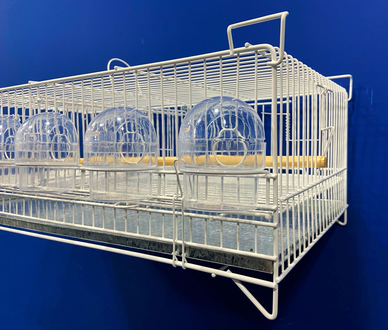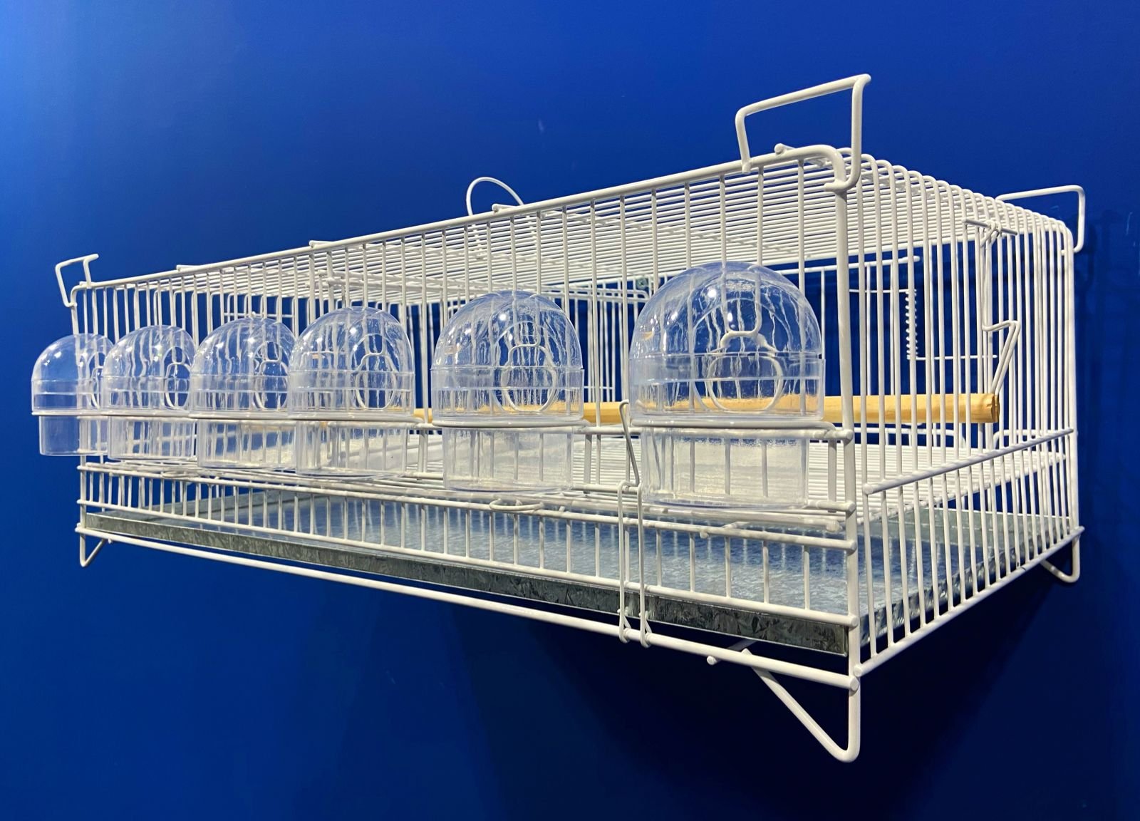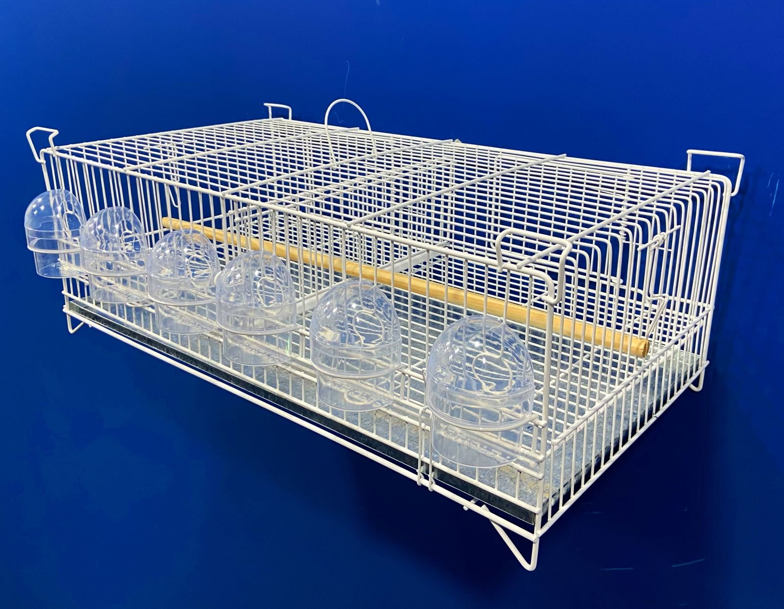 1 poleiro de madeira horizontal, 6 comedores 1/2 lua transparentes, 1 grade de fundo e 1 chapa de fundo removível.
