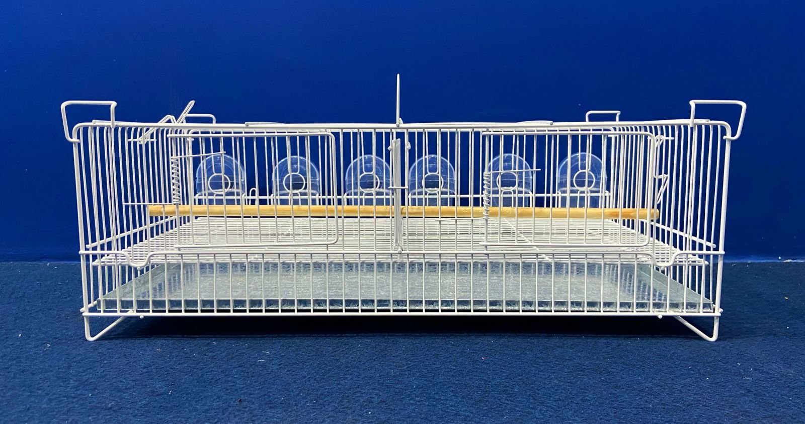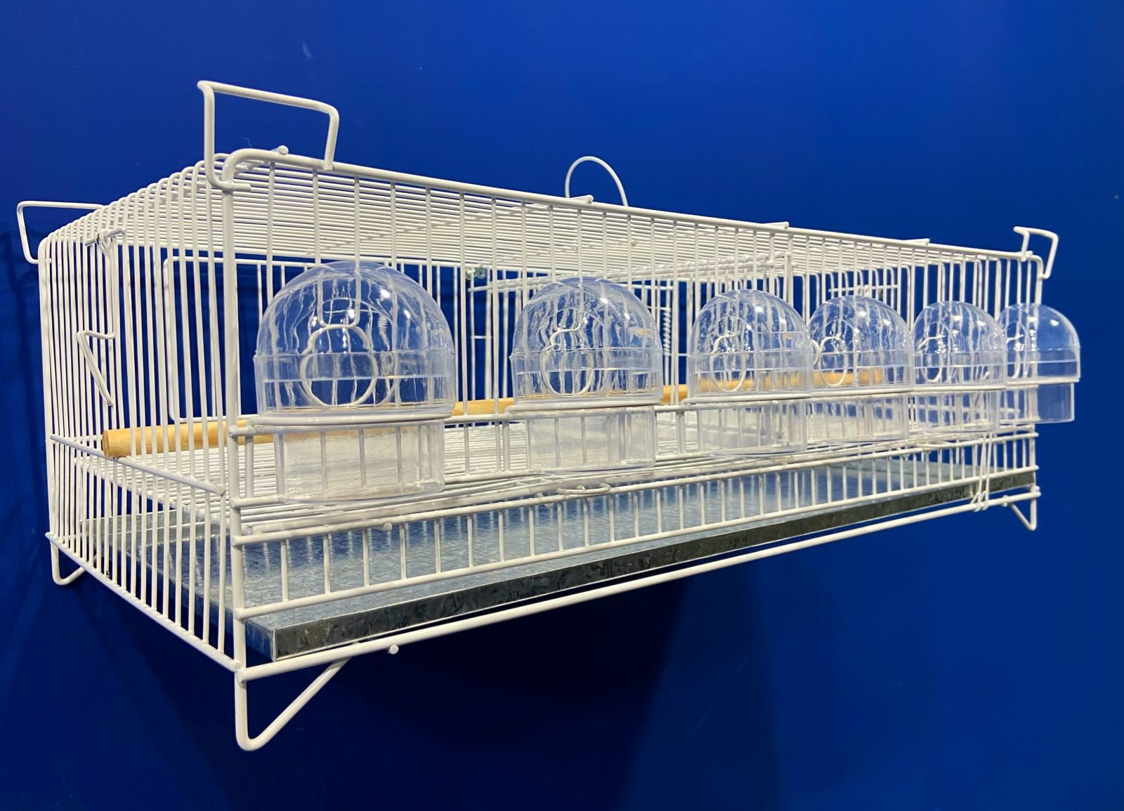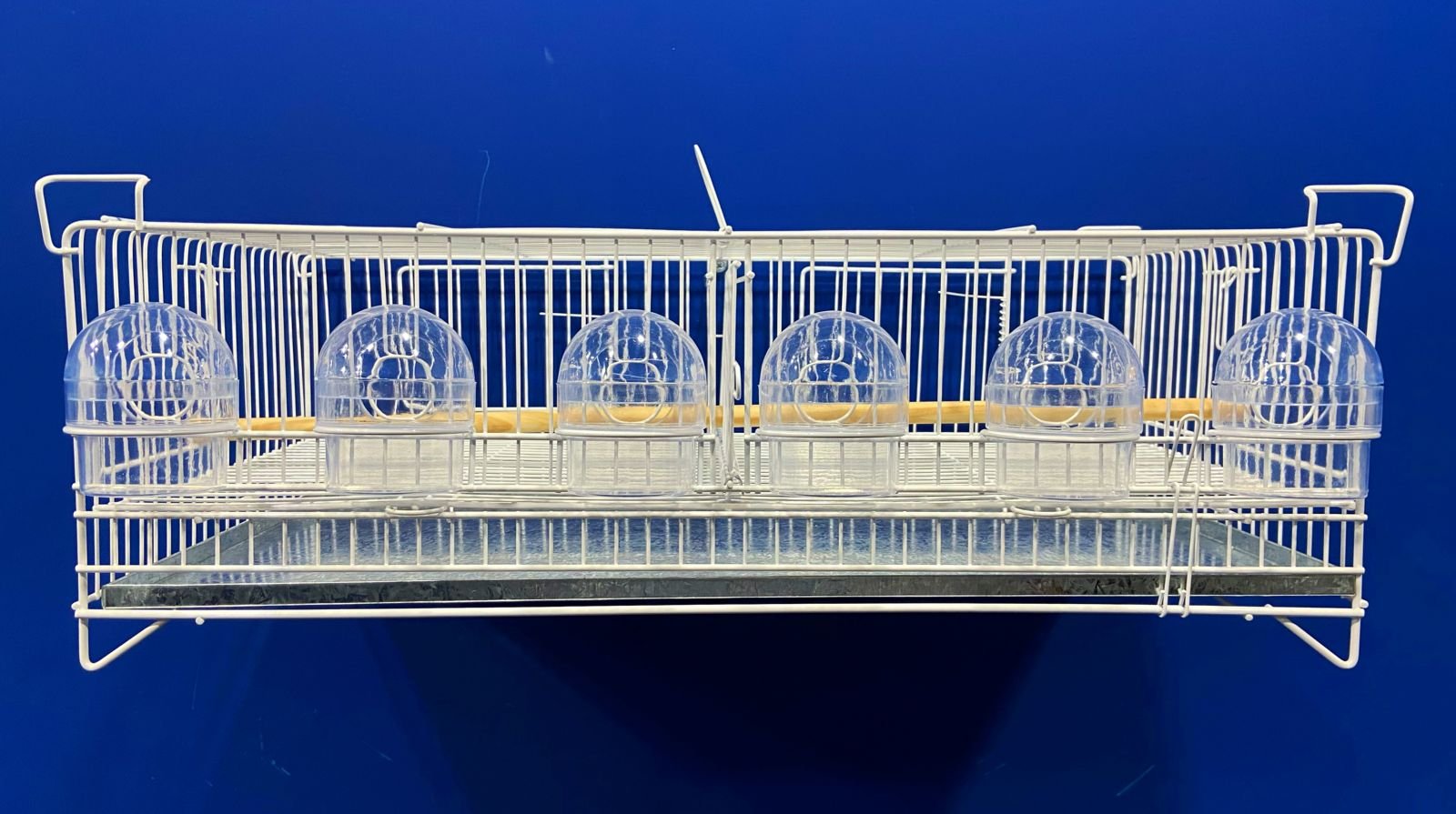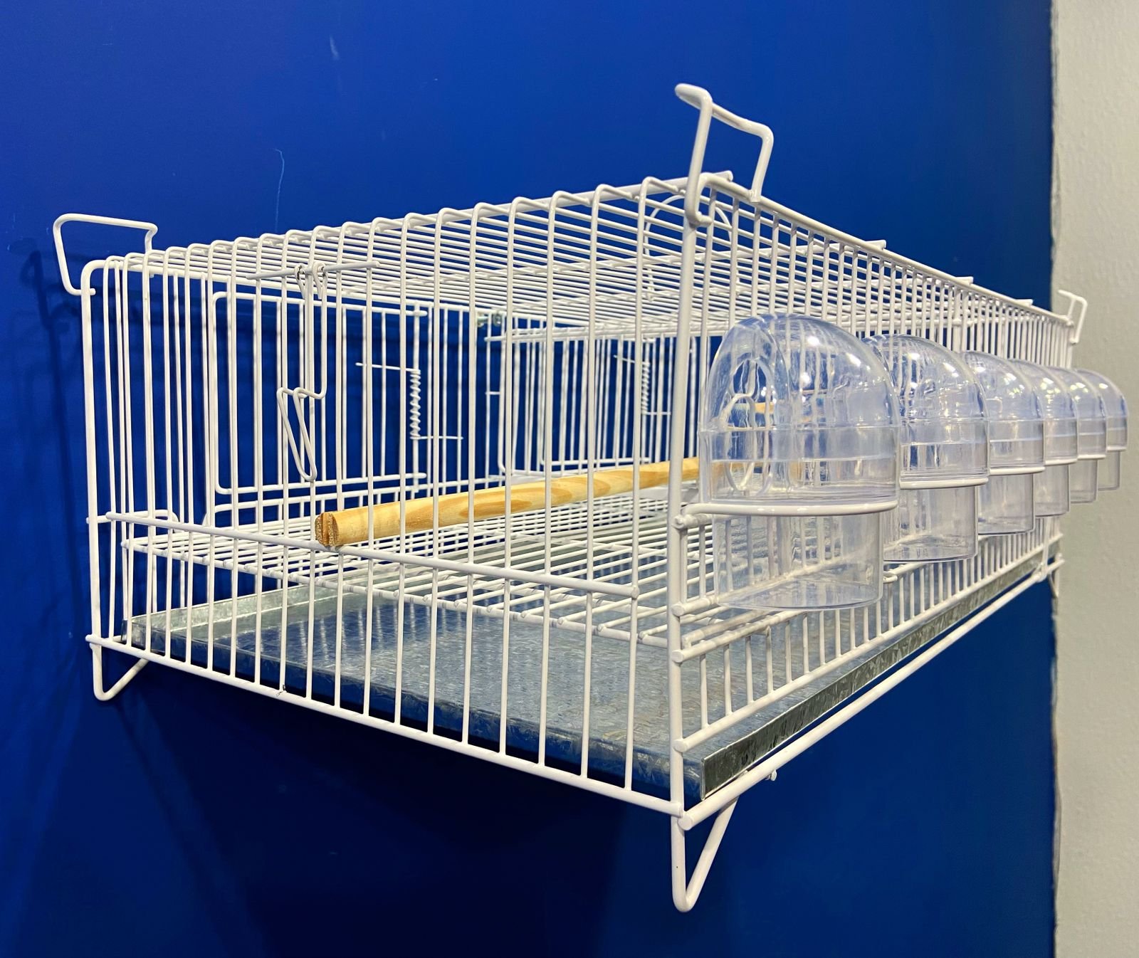 1 poleiro de madeira horizontal, 6 comedores 1/2 lua transparentes, 1 grade de fundo e 1 chapa de fundo removível.