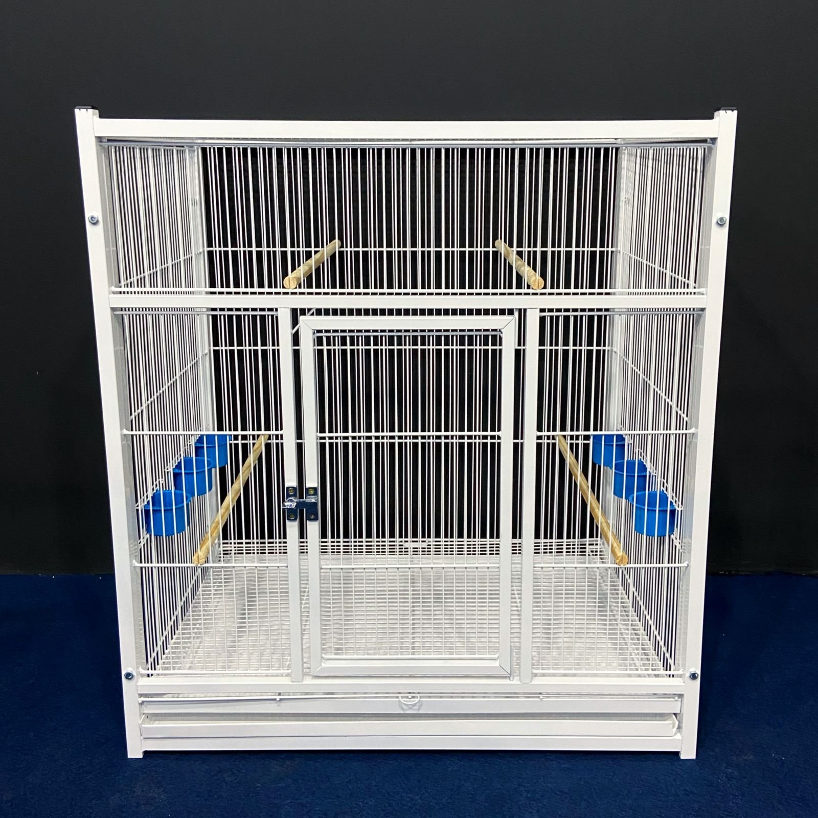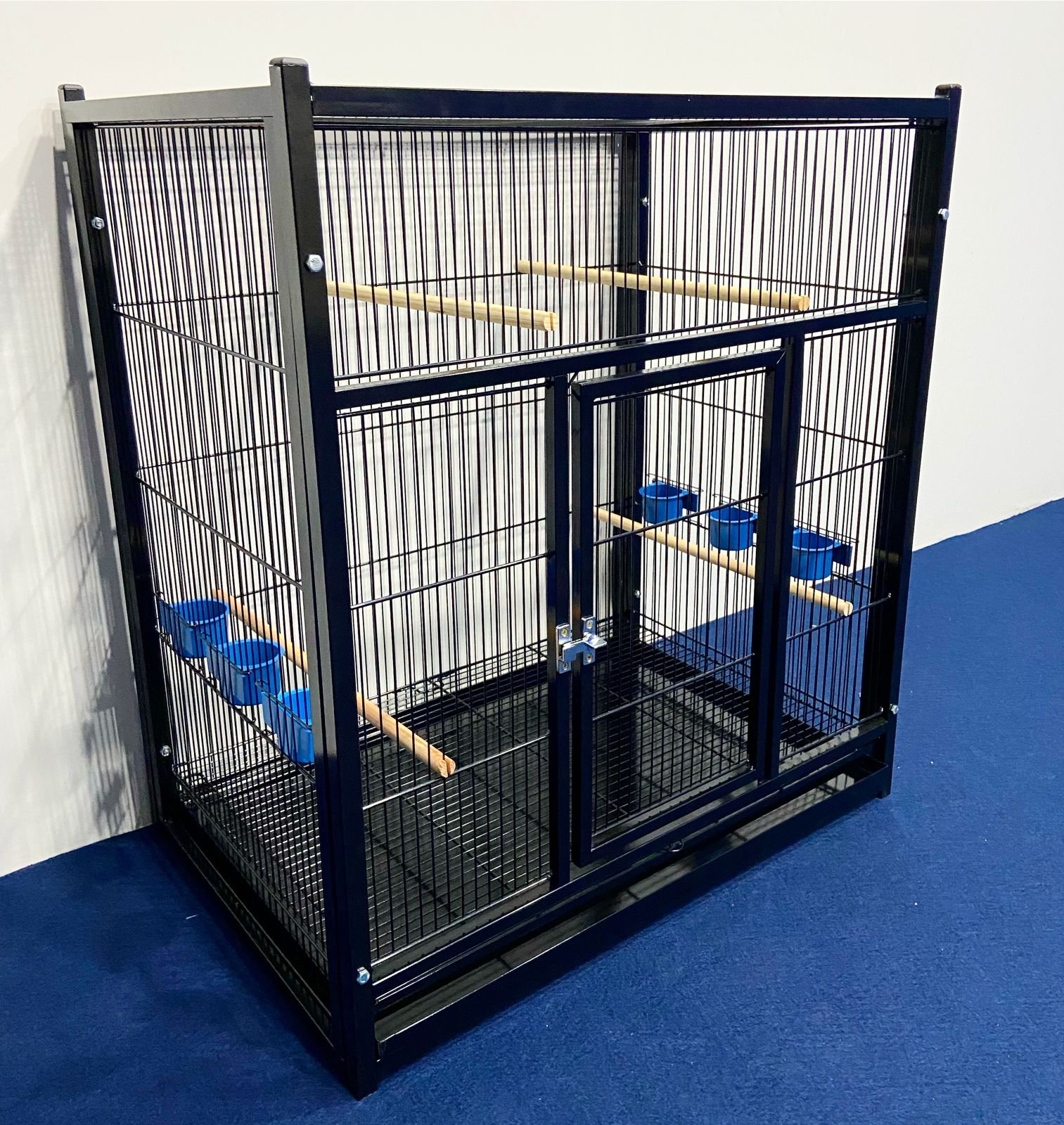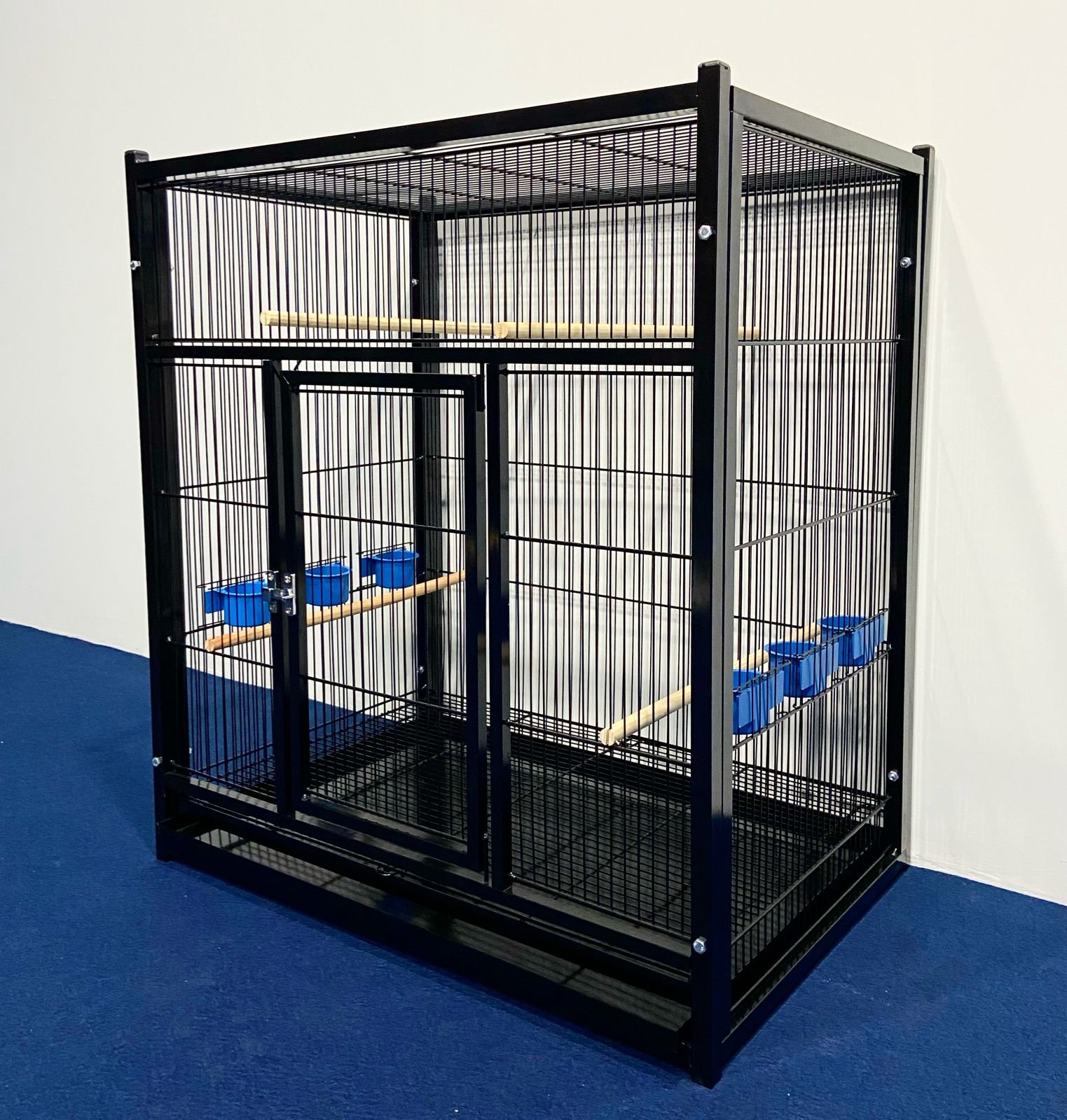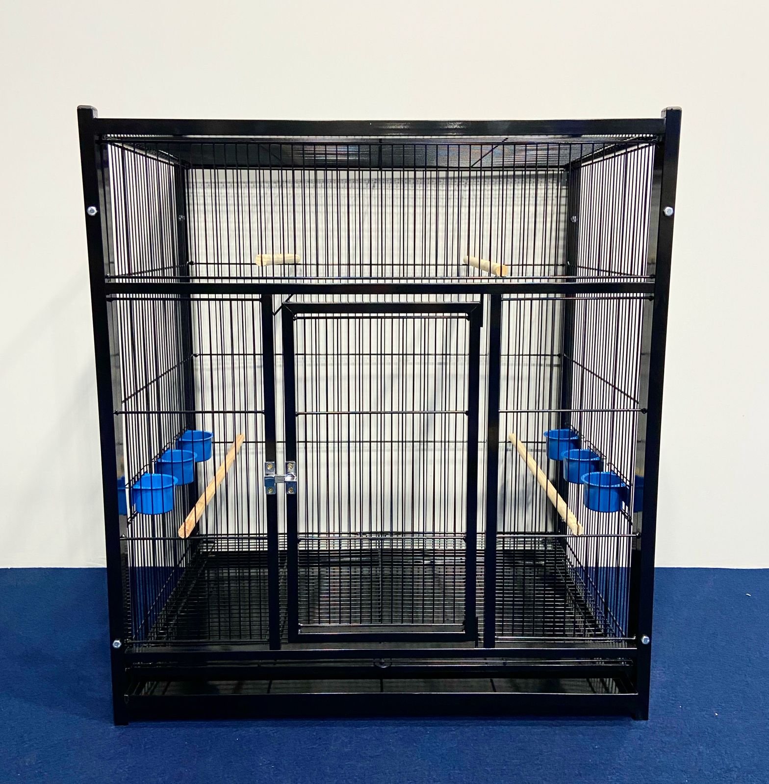 4 poleiros de madeira, 6 comedores plásticos azuis, 1 chapa de fundo e 1 grade de fundo removível.