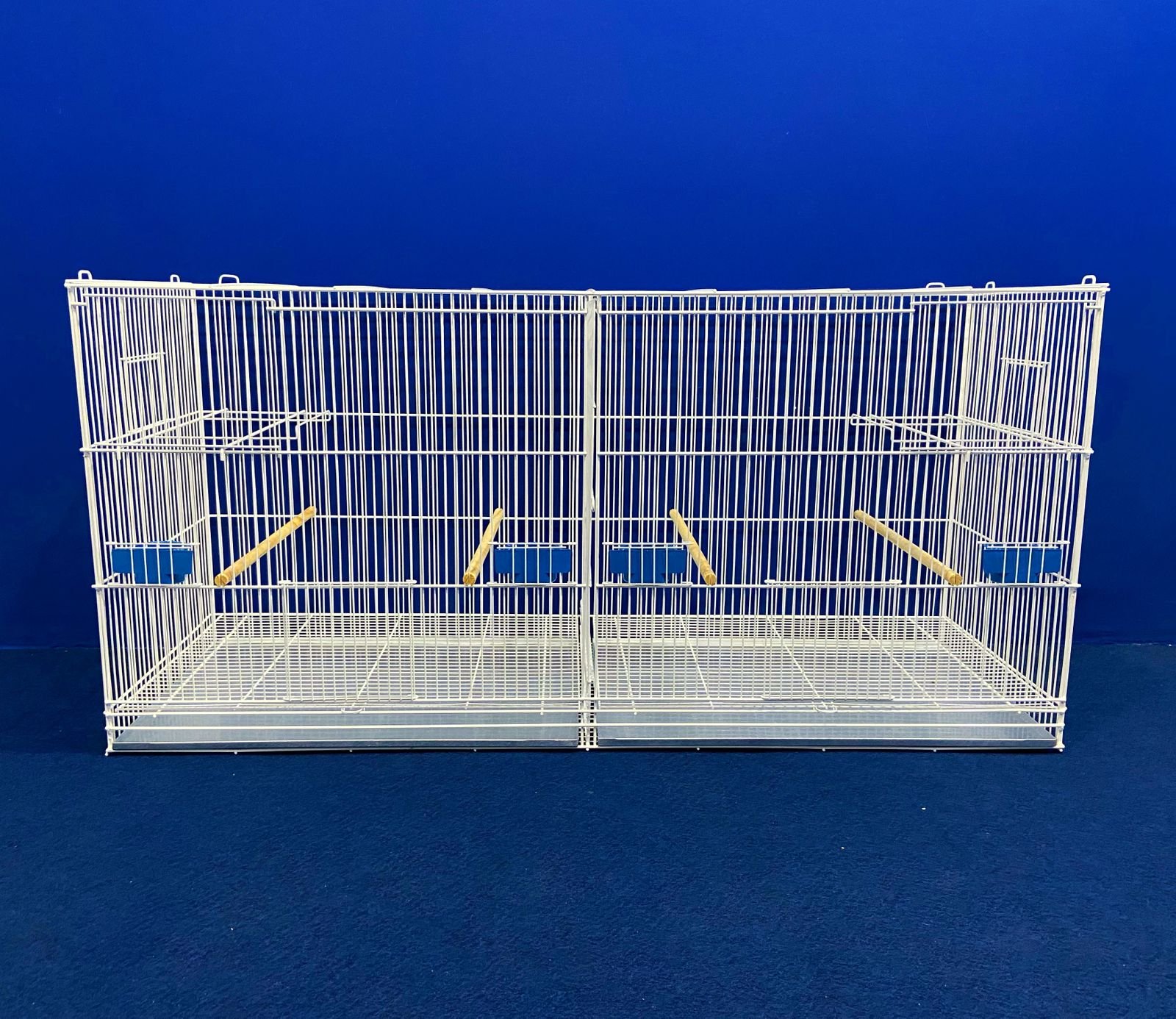 6 poleiros de madeira, 4 comedores plásticos, 2 chapas de fundo, 2 grades de fundo, 2 suportes para ninho, e 1 grade divisória (todos removíveis).