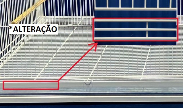3 poleiros de madeira 16mm + 1 poleiro para a porta, 1 chapa de fundo, 1 chapinha p/ a porta, e 1 grade de fundo removível.