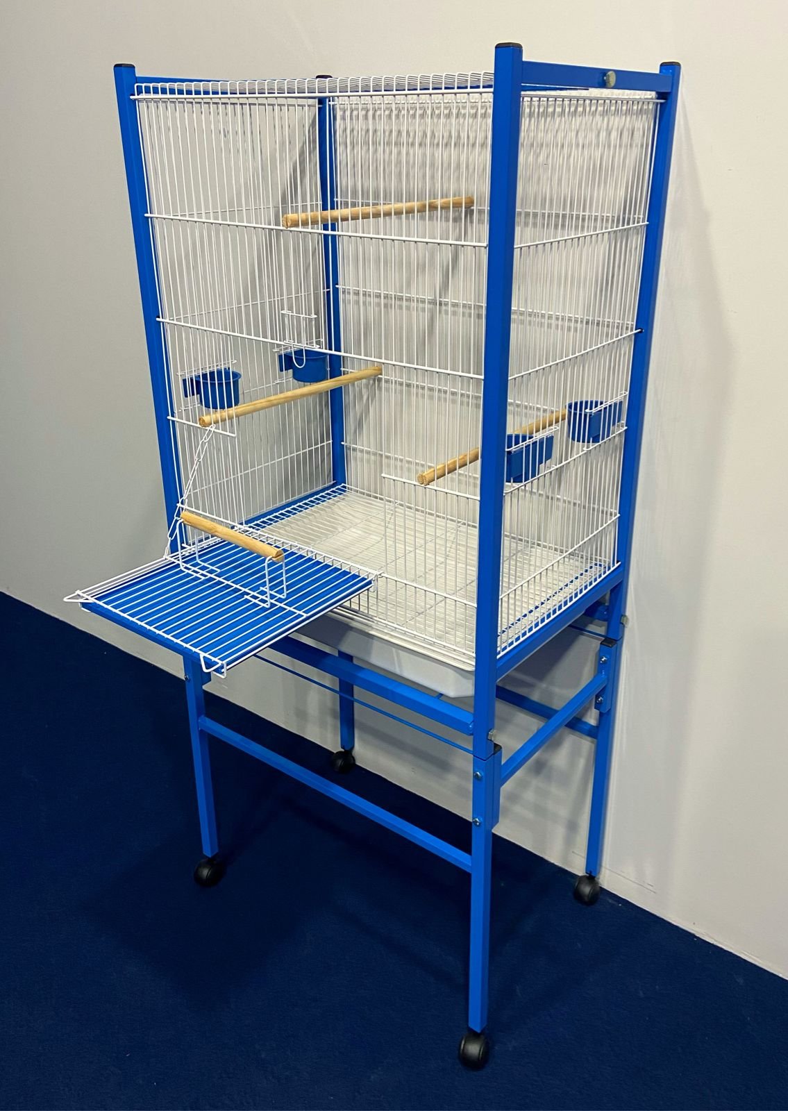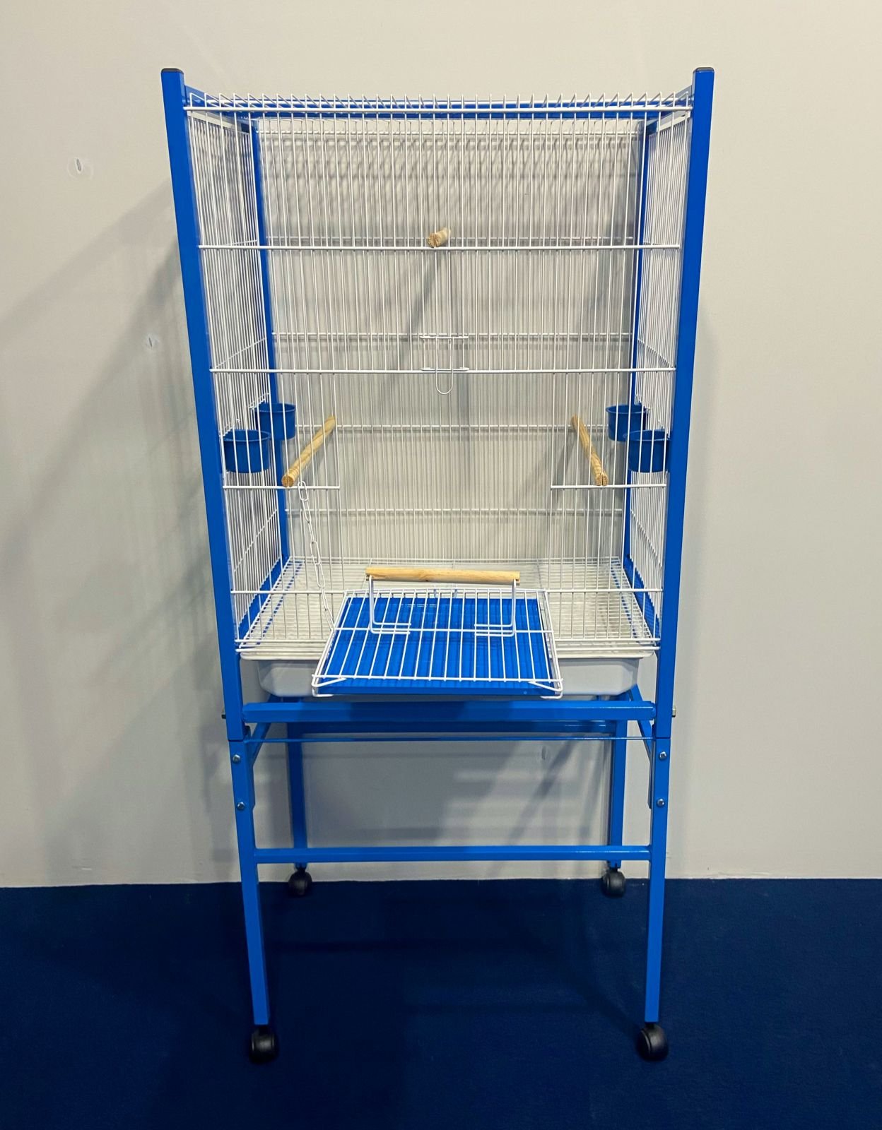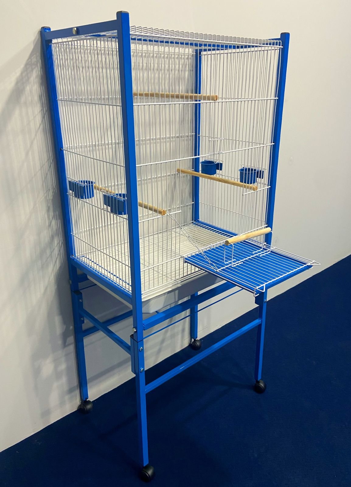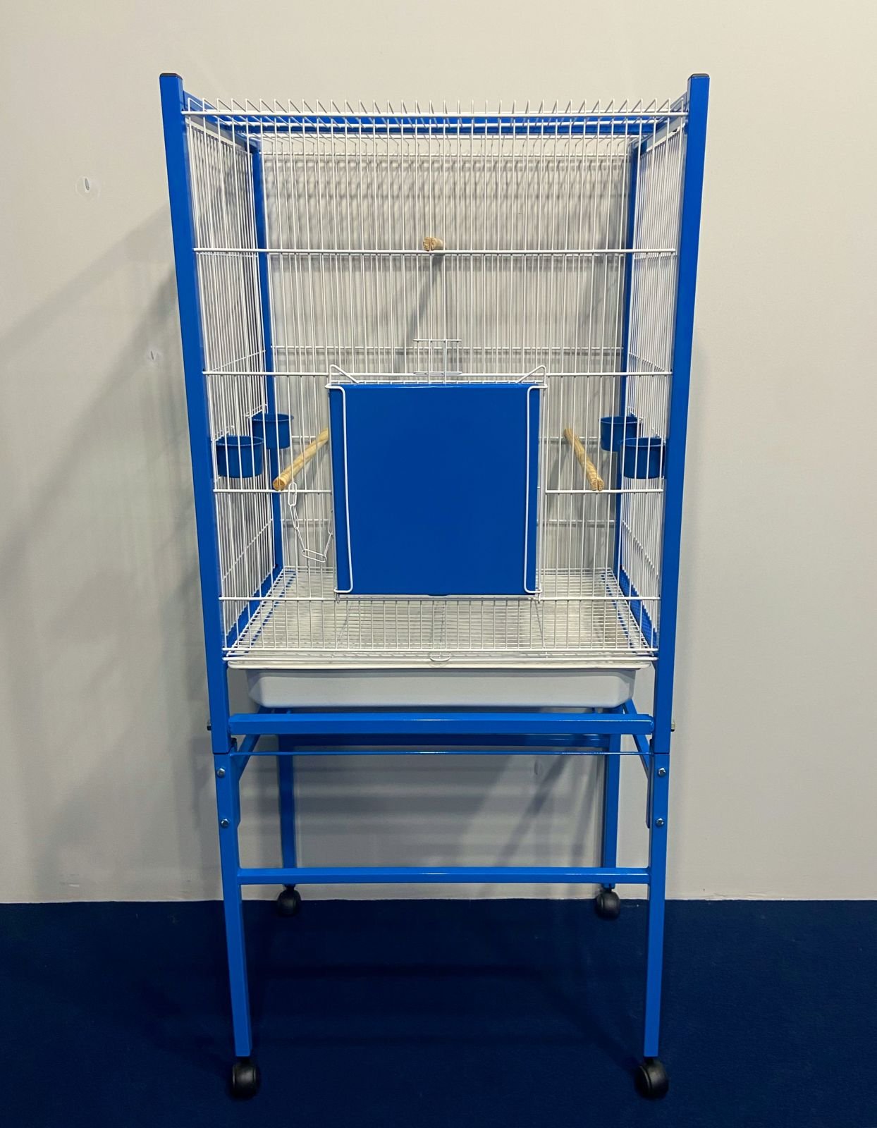3 poleiros de madeira interior + 1 poleiro p/ a porta, 4 comedores plásticos azuis, 1 bandeja plástica de fundo, 1 chapinha p/ a porta, e 1 grade de fundo removível.