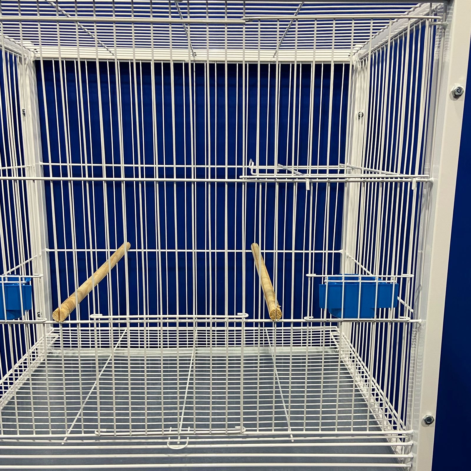 3 poleiros de madeira 15mm, 2 comedores plásticos azuis, 1 chapa de fundo, 1 grade de fundo, e 1 suporte para ninho (todos removíveis).
